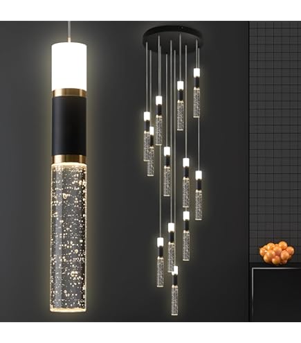- A stunning multi-light LED chandelier featuring cascading bubble glass cylinders.